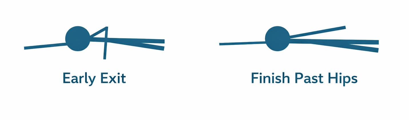 Almost universally, the dominant arm finishes past the hips and the non-dominant arm exits short of the hips.