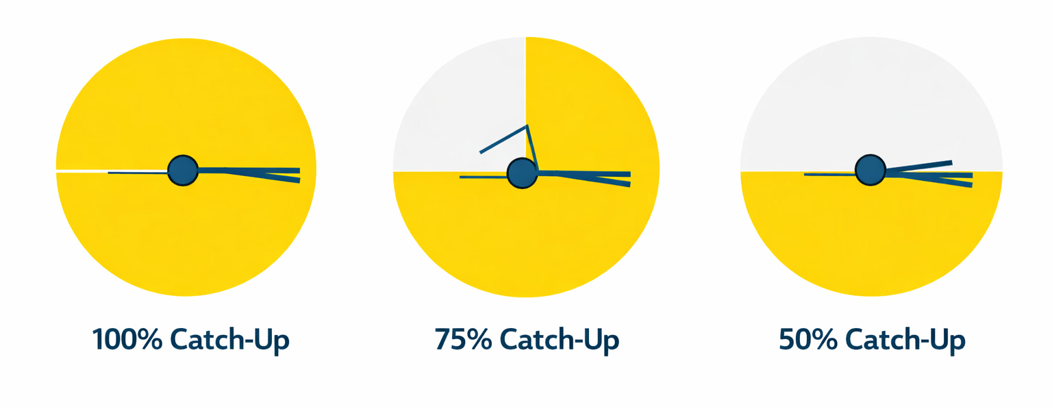 100% Catch-up: the recovery arm completes 100% of the pathway at the moment the catch is initiated.
